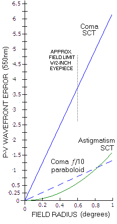 For comparison, coma in an ƒ/10 paraboloid (dashed blue) is nearly five times smaller. Since the linear coma of a paraboloid changes with the 3rd power of focal ratio, the SCT linear field is, coma-wise, comparable to an ƒ/6 paraboloid. Angularly, coma in a paraboloid changes with the square of focal ratio, thus the SCT field compares to that of an ƒ/4.7 paraboloid. Specifically, the diffraction limited field radius in the SCT (only considering coma, but astigmatism is negligibly small at those field angles) is 2.5mm vs. 11.2mm in an ƒ/10 paraboloid. Angular diffraction limited field radius in the SCT (4.3 arc minutes) is as many times smaller than that in the paraboloid, and equal to the diffraction limited field of an ƒ/4.7 paraboloid. Astigmatism in the SCT is only slightly stronger than in the comparable paraboloid, 1.6 vs. 1.4 wave P-V at 1° off axis. While this far off axis it equals coma in the paraboloid (as the P-V wavefront error), in the SCT is still only a small fraction of the coma wavefront error. It does not matter much in practical terms, since it is normally eyepiece astigmatism that dominates the outer field; it merely gets more distorted by coma in the SCT. ● field curvature; of interest are Petzval field curvature, which is not affected by the corrector and, thus, remains as for any two-mirror system, 1/RP=(2/R2)-(2/R1)=2(1-ρ)/ρR1, and best image surface curvature (or median astigmatic curvature) which is, in the presence of astigmatism, given by 1/Rm=(1/RP)+4as or: