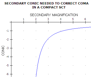 is the secondary mirror stop separation (i.e. exit pupil, or image of the aperture stop formed by the primary to secondary separation), in units of the secondary's radius of curvature (pupil-to-secondary separation is numerically negative for the aperture stop located inside primary's focus); as before, ρ=R2/R1. In the typical ƒ/2/10 commercial SCT (i.e. with secondary magnification m~5), k~0.25, σ1~0.4, ρ~0.31 and σ2~-7.6. Taking σ1~0.4 (it does not change significantly with the change in secondary size within practical range), and substituting for k and ρ in terms of secondary magnification m, gives a good approximation in terms of secondary magnification as σ2~(η-5m-4)(m-1)/2m(1+η), where η is the back focal length in units of primary's focal length. For the standard η=0.5, the secondary mirror stop separation is σ2=0.5-(5m/3)+(3.5/3m). Setting c1=-c2 gives the secondary conic needed for zero coma as: