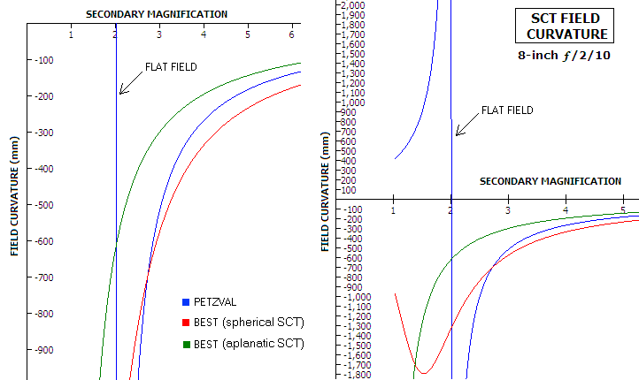 Substituting for ρ in terms of m and k, with k=(1+η)/(m+1), the Petzval surface curvature can be also written as RP=(1+η)mR1/2[m2-1-(1+η)m] with the back focal length in units of primary's f.l. being η~0.5 for systems with ƒ/2 primary. Graph below shows field curvatures for the typical 8-inch ƒ/2/10 SCT with η=0.5, based on Eq. 118. Due to the difference in their astigmatism, a system with spherical mirrors has somewhat weaker, and aplanatic (w/aspherized secondary) somewhat stronger best image curvature than their Petzval. If the Petzval and astigmatism are of the same sign, they add up arithmetically to a stronger best image curvature, and they offset each other when of opposite sign, resulting in theee weaker median image curvature. Since the median surface is midway between the sagittal and tangential surface, with the tangential surface always 3 times farther away from the Petzval than sagittal (by 6a vs. 2a, a being the system astigmatism coefficient), median surface is flat when the astigmatism coefficient is one fourth of the Petzval value, and of opposite sign. While Petzval surface becomes flat with secondary magnification m~2, neither spherical-mirrors nor aplanatic (aspherized secondary) can have flat best image surface. It is weaker with lower secondary magnifications (i.e. with larger secondary), and is generally more curved in the aplanatic arrangement.