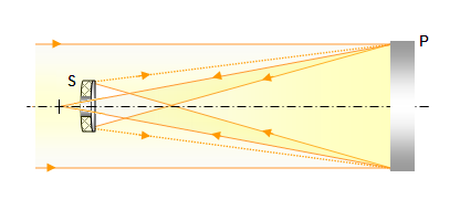 FIGURE 125: Two-mirror 3-reflection system in the Gregorian arrangement. Concave secondary mirror (S) reflects light back to the primary (P), which then forms the final focus through an opening on the secondary. Correction of all three primary point-image aberrations, spherical, coma and astigmatism is possible with ellipsoidal primary and hyperboloidal secondary mirror. The only remaining aberration is relatively strong field curvature. The final system's focal ratio F is larger by nearly 1/3 than focal ratio of the primary. Originally, the arrangement was first published by Shaffer, but somewhat better corrected systems of this kind are achievable. These systems are effectively three-mirror systems, and aberration coefficients are more complicated. It would suffice here to give a working prescription. Relative system parameters (units of the primary radius of curvature) of the Gregorian two-mirror 3-reflection anastigmatic aplanat are very simple: