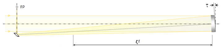 Small long-focus mirrors can be left spherical, since their spherical aberration is negligible. However, the tilt-induced center-field astigmatism and coma still can cause unacceptable image deterioration. The mirror tilt angle τ will result in the P-V wavefront error of astigmatism Wa=τ2D/8F (from Eq. 18), and the coma P-V wavefront error of Wc=τD/48F2 (from Eq. 12-15.1), both at their respective diffraction foci. If ζ is the relative distance in units of the primary focal length at which the ray reflected from the mirror center breaks out of the path of incoming axial pencil (FIG. 85), then the tilt angle τ=1/4ζF in radians, and the two can be written as: